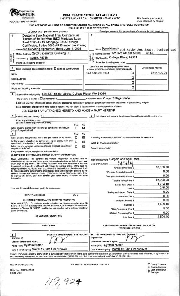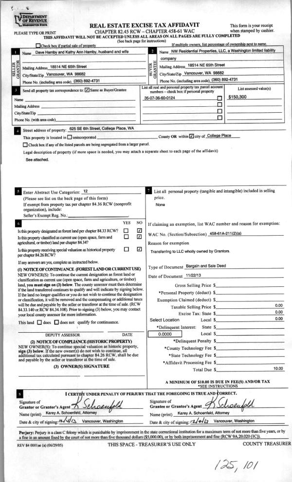 | 2 | 12/13/2013 | BARGAIN & | BARGAIN & SALE DEED | HAMBY DAVE & KATHY ANN | NW RESIDENTIAL PROPERTIES LLC | | | | 125101 | 2013-11925 |