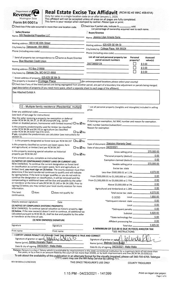 | 1 | 04/23/2021 | SWD | STATUTORY WARRANTY DEED | NW RESIDENTIAL PROPERTIES LLC | SORIA JESSICA L ARREOLA | | | $370,000.00 | 141399 | 2021-04795 |