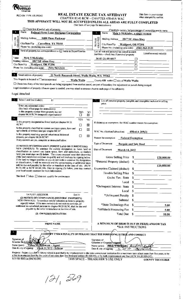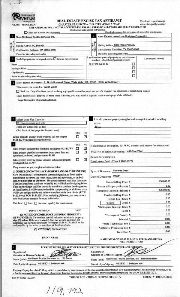 | 3 | 02/28/2011 | WARRANTY D | WARRANTY DEED | NORTHWEST TRUSTEE SERVICES INC | FEDERAL HOME LOAN MORTGAGE COR | | | $136,000.00 | 119792 | 2011-01799 |