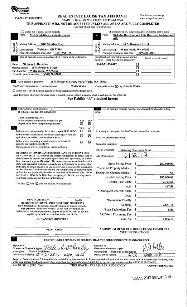 | 1 | 06/13/2017 | SWD | STATUTORY WARRANTY DEED | MC KINLEY MELE S | HAZELTINE NICHOLAS & ELLIE | | | $187,000.00 | 132591 | 2017-04516 |