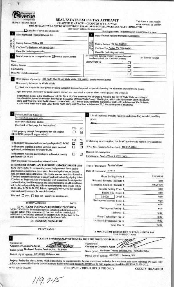 | 4 | 02/17/2011 | WARRANTY D | WARRANTY DEED | NORTHWEST TRUSTEE SERVICES INC | FEDERAL NATIONAL MORTGAGE~ASSO | | | $116,203.00 | 119745 | 2011-01555 |