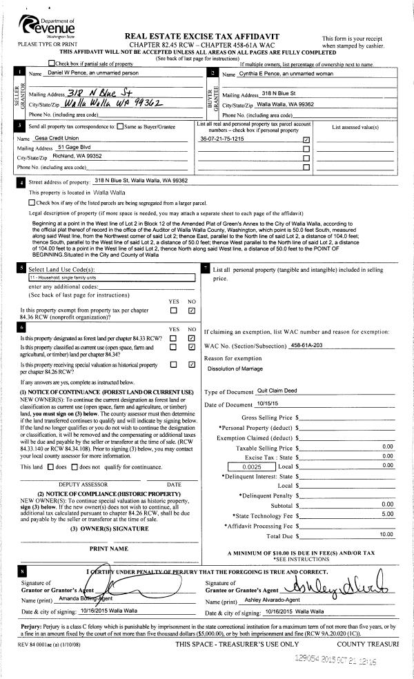 | 1 | 10/15/2015 | QCD | QUIT CLAIM DEED | PENCE DANIEL W | PENCE CYNTHIA E | | | | 129054 | 2015-09227 |