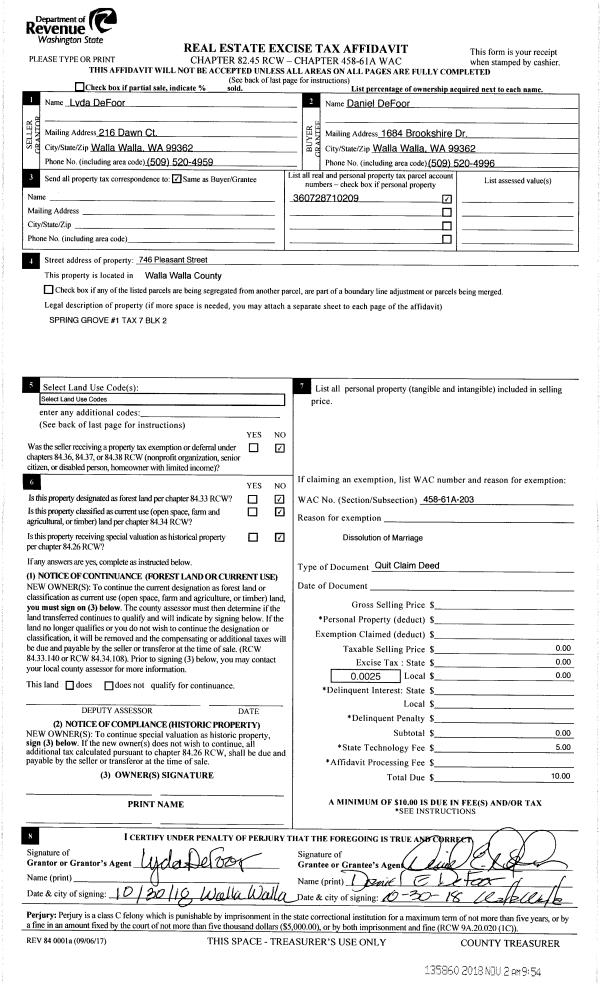 | 1 | 10/30/2018 | QCD | QUIT CLAIM DEED | DEFOOR DANIEL E & LYDA S | DE FOOR DANIEL | | | $0.00 | 135860 | 2018-09083 |