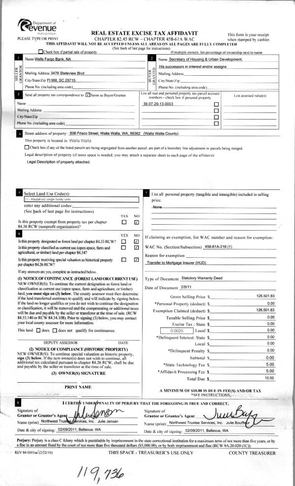 | 4 | 01/12/2011 | WARRANTY D | WARRANTY DEED | NORTHWEST TRUSTEE SERVICES INC | WELLS FARGO BANK NA | | | $138,937.00 | 119589 | 2011-00384 |