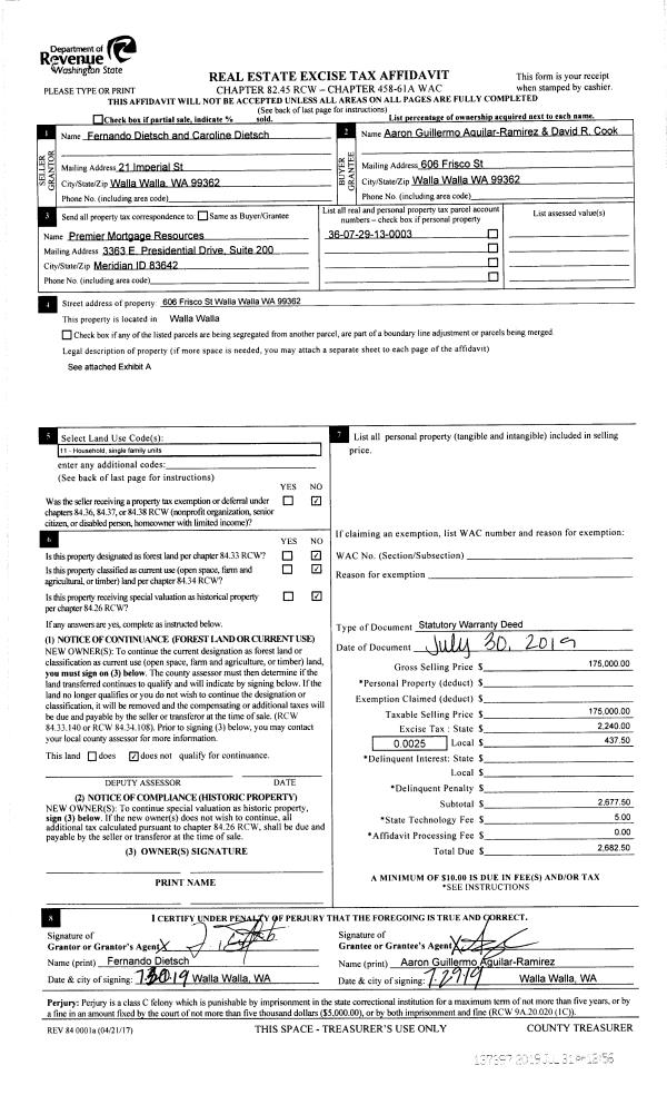 | 1 | 07/31/2019 | SWD | STATUTORY WARRANTY DEED | DIETSCH FERNANDO & CAROLINA | AGUILAR-RAMIREZ AARON GUILLERMO | | | $175,000.00 | 137397 | 2019-05632 |
