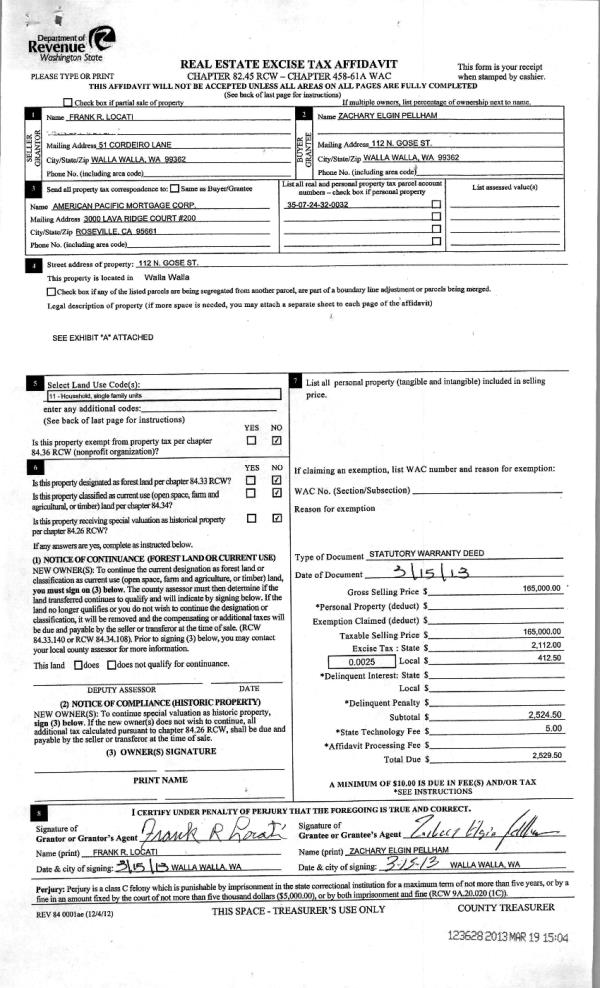 | 3 | 03/19/2013 | WARRANTY D | WARRANTY DEED | LOCATI, FRANK R | PELLHAM, ZACHARY ELGIN | | | $165,000.00 | 123628 | 2013-02578 |