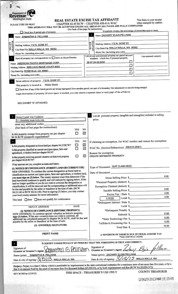 | 2 | 03/19/2013 | QCD | QUIT CLAIM DEED | PELLHAM, SAMANTHA B | PELLHAM, ZACHARY ELGIN | | | $0.00 | 123629 | 2013-02579 |