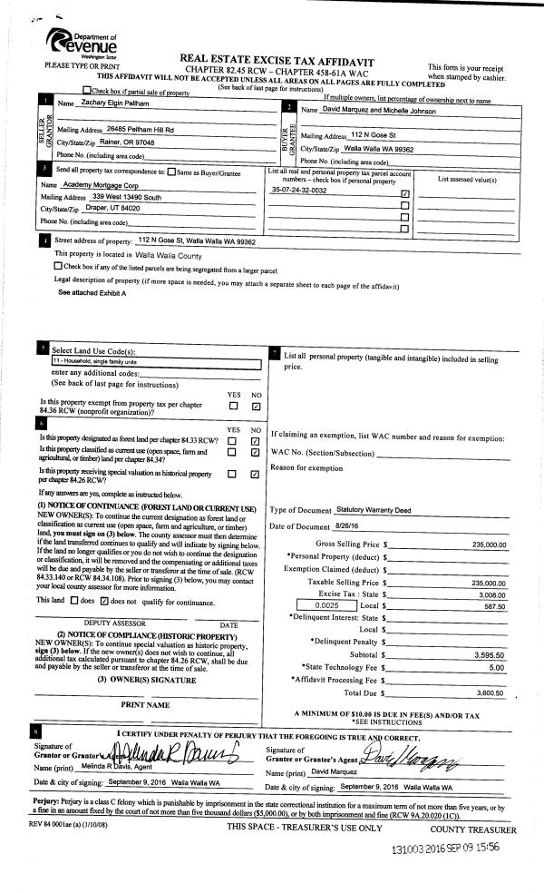 | 1 | 09/09/2016 | SWD | STATUTORY WARRANTY DEED | PELLHAM ZACHARY ELGIN | MARQUEZ DAVID | | | $235,000.00 | 131003 | 2016-07377 |