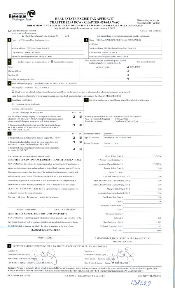 | 2 | 01/30/2020 | TRUSTEES D | TRUSTEE'S DEED | HOLM JERRY E & JOYCE C | FEDERAL NATIONAL MORTGAGE ASSOCIATION | | 2-PARCEL | $275,000.00 | 138527 | 2020-00880 |