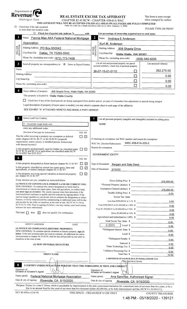 | 1 | 05/18/2020 | BARGAIN & | BARGAIN & SALE DEED | FEDERAL NATIONAL MORTGAGE ASSOCIATION | ANDERSON ANDRAYA E & KURT M | | 2-PARCELS | $275,000.00 | 139121 | 2020-04322 |