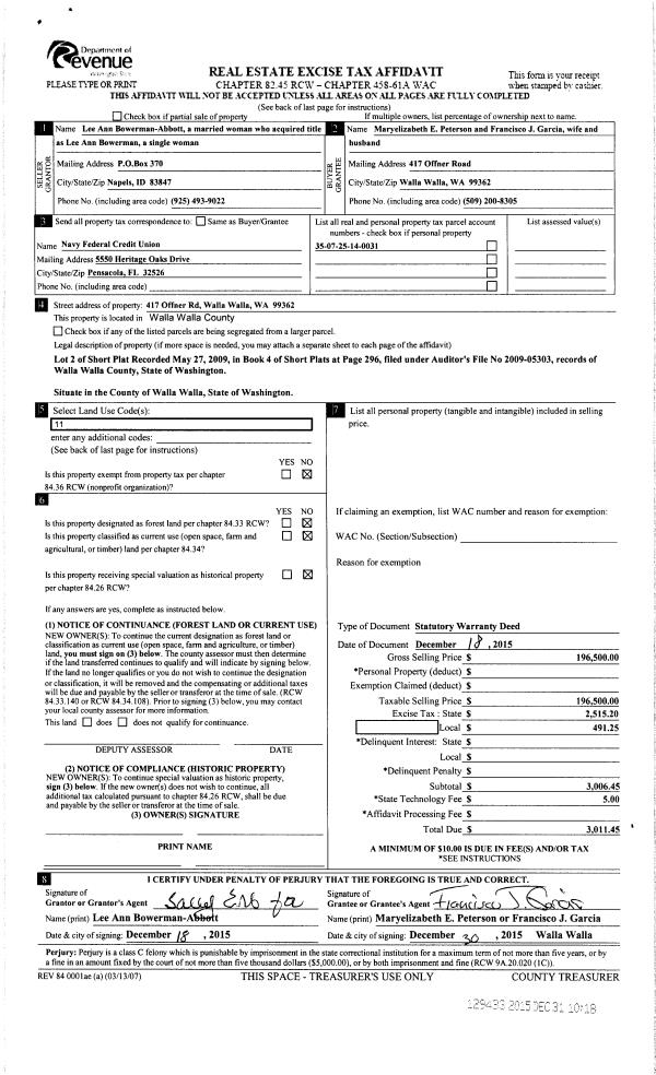 | 2 | 12/31/2015 | SWD | STATUTORY WARRANTY DEED | BOWERMAN LEE ANN | GARCIA MARYELIZABETH E | | | $196,500.00 | 129433 | 2015-11174 |