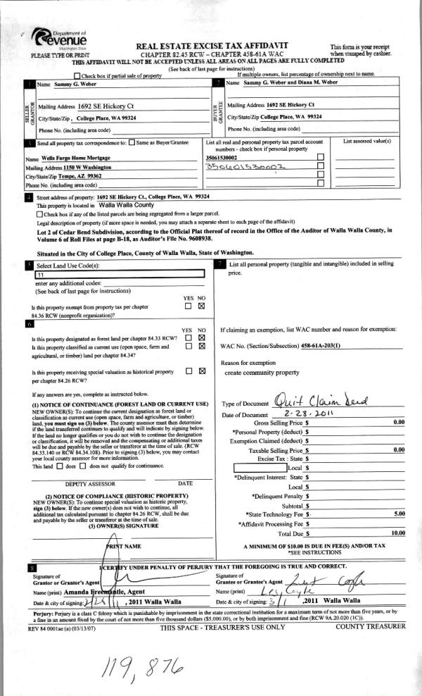 | 5 | 03/14/2011 | QCD | QUIT CLAIM DEED | WEBER, SAMMY G | WEBER, SAMMY G & DIANA M | | | | 119876 | 2011-02216 |