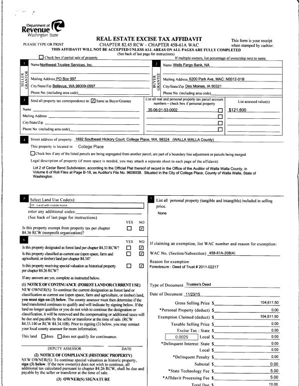| Mailing Address: | 1692 SE HICKORY CT COLLEGE PLACE, WA 99324 | % Ownership: | 100.0000000000% |