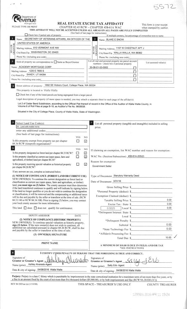 | 1 | 03/31/2016 | SWD | STATUTORY WARRANTY DEED | SECRETARY OF VETERANS AFFAIRS | SNOW BLAKE E | | | $0.00 | 129986 | 2016-02608 |