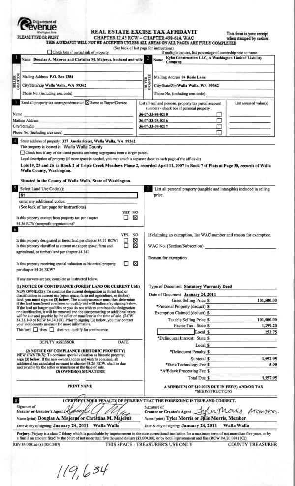 | 3 | 01/24/2011 | WARRANTY D | WARRANTY DEED | MAJERUS DOUGLAS & CHRISTINA M | KYKO CONSTRUCTION LLC | | | $101,500.00 | 119634 | 2011-00728 |