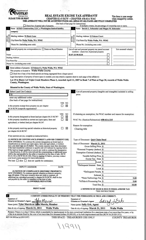 | 1 | 03/21/2011 | QCD | QUIT CLAIM DEED | KYKO CONSTRUCTION LLC | SCHOESSLER, DERICK L & MEGAN M | | | $0.00 | 119911 | 2011-02469 |