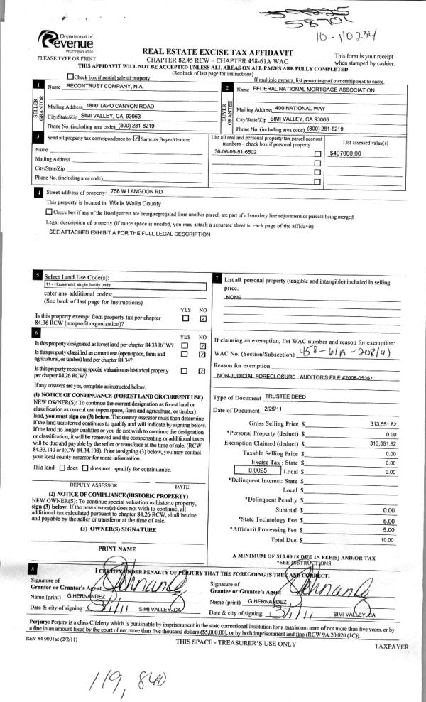 | 3 | 03/04/2011 | WARRANTY D | WARRANTY DEED | RECONTRUST COMPANY NA | FEDERAL NATIONAL MORTGAGE~ASSO | | | $313,551.00 | 119840 | 2011-02026 |