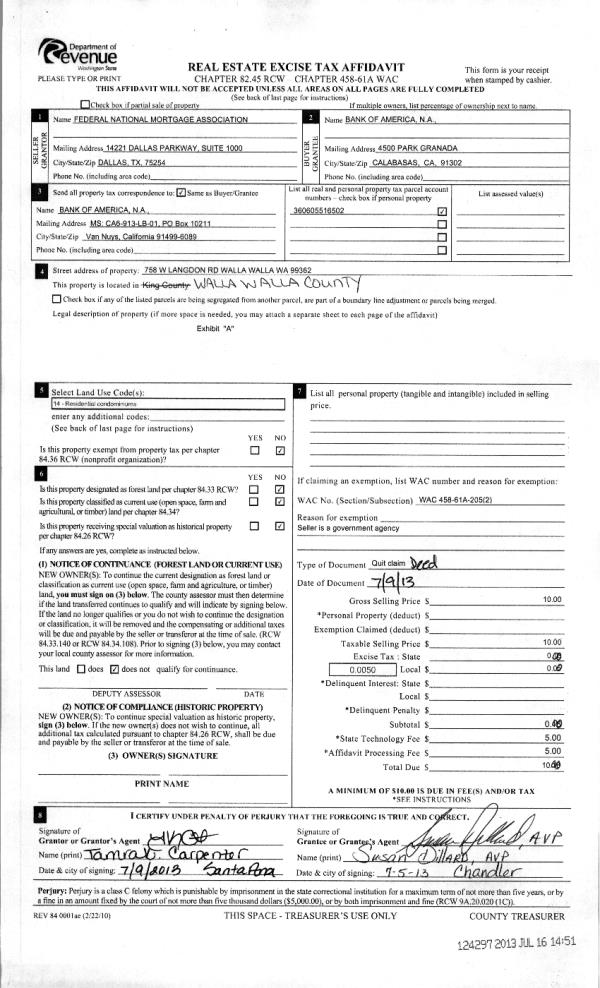 | 1 | 07/16/2013 | QCD | QUIT CLAIM DEED | FEDERAL NATIONAL MORTGAGE ASSO | BANK OF AMERICA | | | $0.00 | 124297 | 2013-07156 |