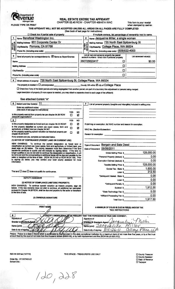 | 2 | 06/01/2011 | WARRANTY D | WARRANTY DEED | BENEFICIAL WASHINGTON INC | MILLER, JACQUELINE | | | $125,000.00 | 120228 | 2011-04284 |