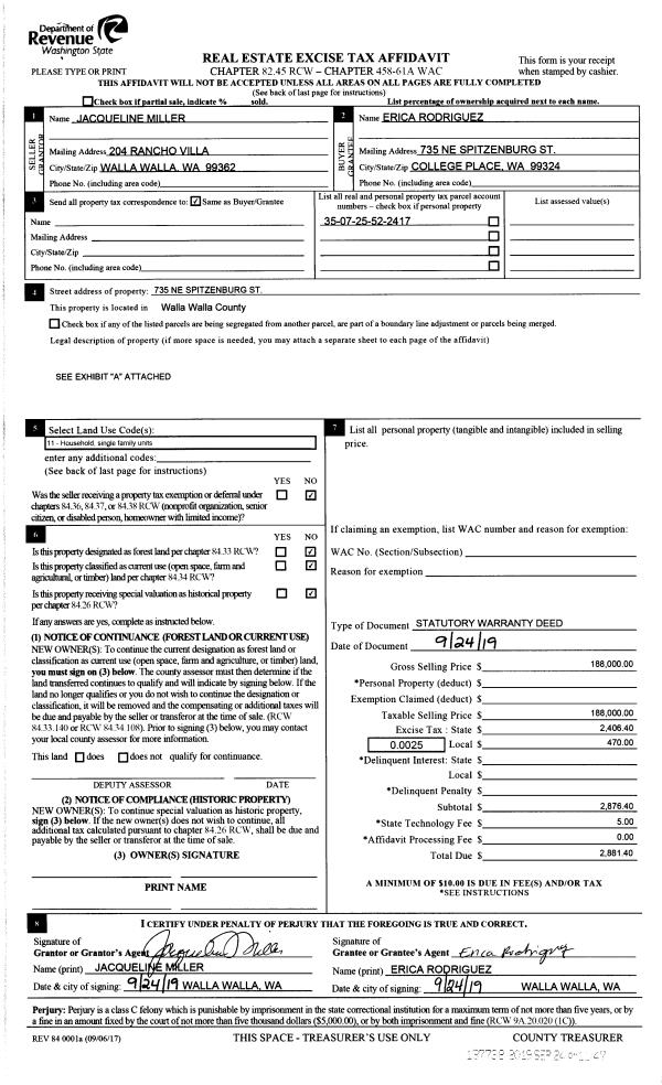 | 1 | 09/24/2019 | SWD | STATUTORY WARRANTY DEED | MILLER JACQUELINE | RODRIGUEZ ERICA | | | $188,000.00 | 137738 | 2019-07541 |