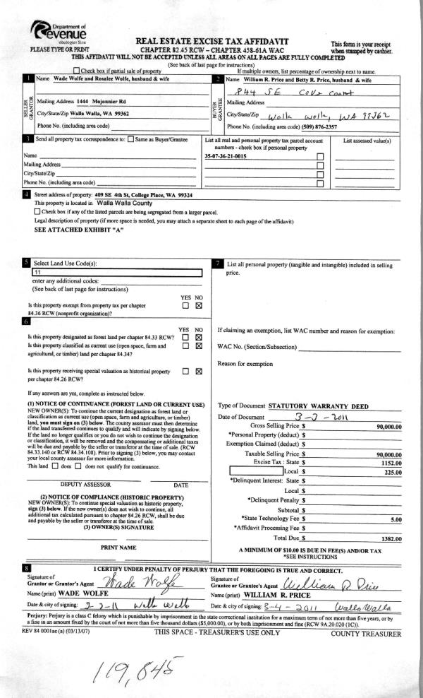 | 3 | 03/04/2011 | WARRANTY D | WARRANTY DEED | WOLFE, WADE H & ROSALEE K | PRICE, WILLIAM R & BETTY R | | | $90,000.00 | 119845 | 2011-02044 |