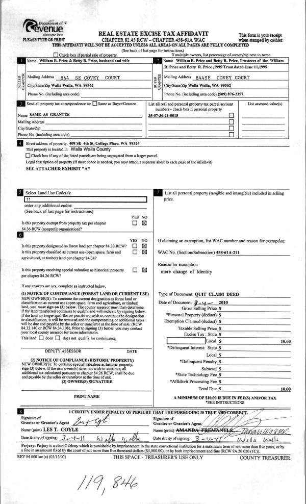 | 4 | 03/04/2011 | QCD | QUIT CLAIM DEED | PRICE, WILLIAM R & BETTY R | PRICE WILLIAM R & BETTY R TRUSTEES | | | $0.00 | 119846 | 2011-02045 |