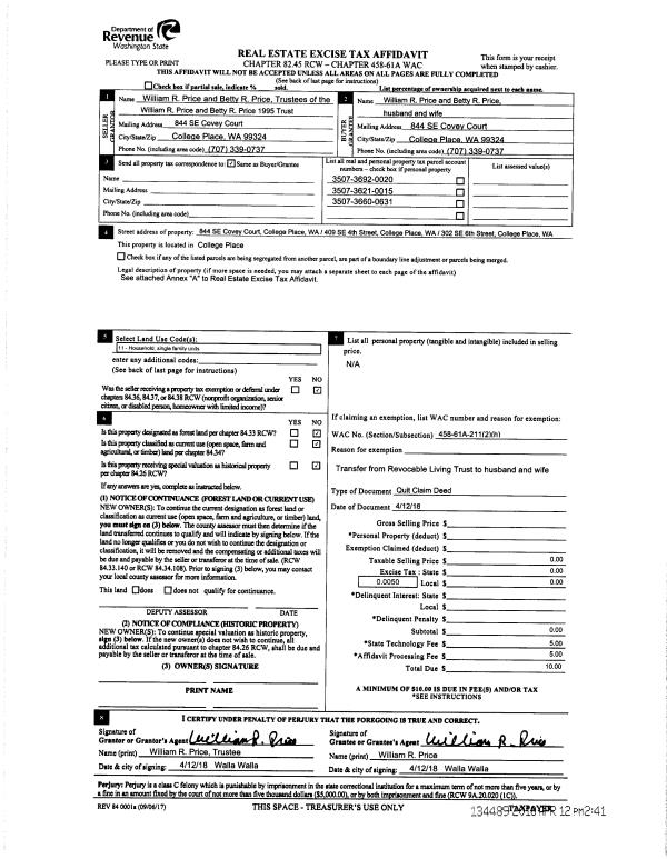 | 2 | 04/12/2018 | QCD | QUIT CLAIM DEED | PRICE WILLIAM R & BETTY R TRUSTEES | PRICE WILLIAM R & BETTY R | | | $0.00 | 134489 | 2018-02829 |
