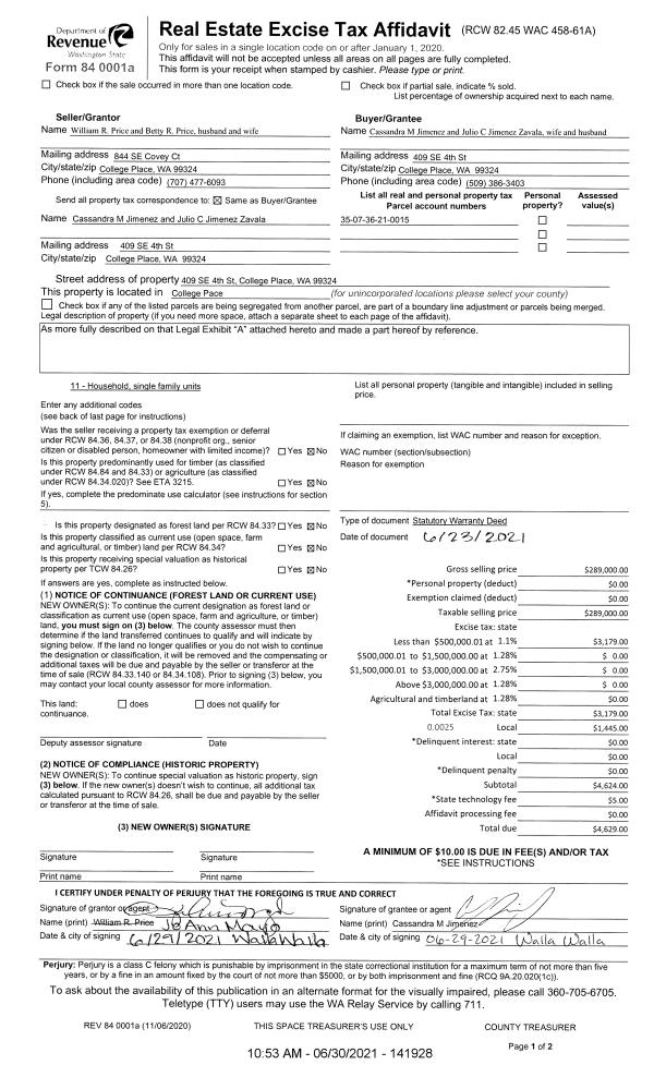| 1 | 06/30/2021 | SWD | STATUTORY WARRANTY DEED | PRICE WILLIAM R & BETTY R | JIMENEZ CASSANDRA M | | | $289,000.00 | 141928 | 2021-07927 |