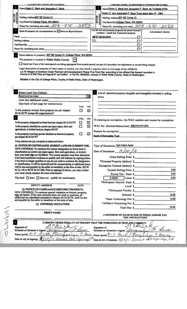 | 4 | 04/04/2011 | QCD | QUIT CLAIM DEED | BECK, EDWIN C & JACQUELYN | BECK, EDWIN C & JACQUELYN F TR | | | | 119970 | 2011-02790 |