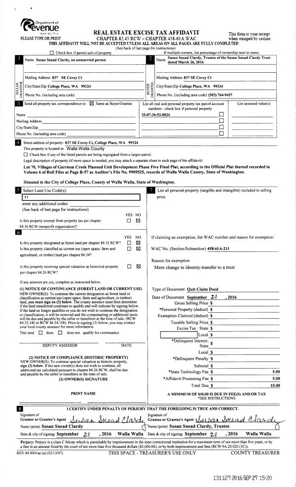 | 2 | 09/21/2016 | QCD | QUIT CLAIM DEED | CLARDY SUSAN SNEAD | CLARDY SUSAN SNEAD TRUST | | | $0.00 | 131127 | 2016-07932 |