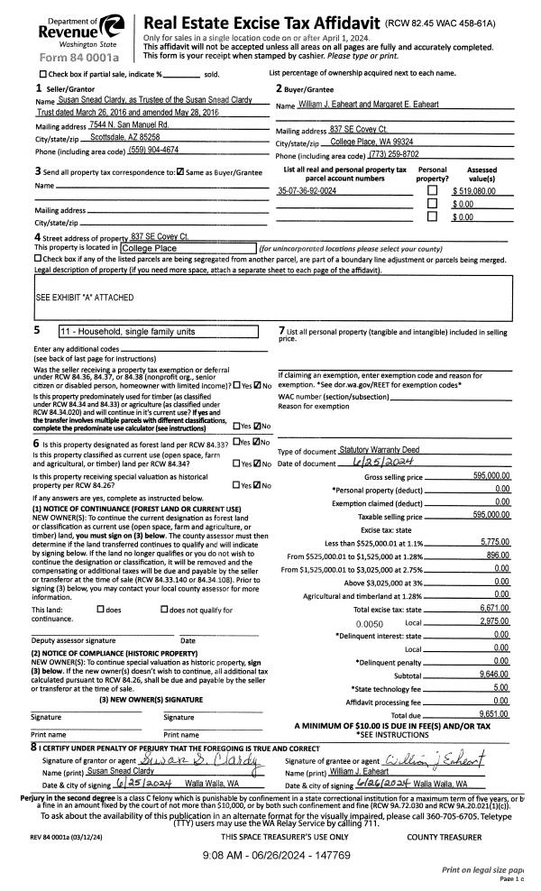 | 1 | 06/26/2024 | SWD | STATUTORY WARRANTY DEED | CLARDY SUSAN SNEAD TRUST | EAHEART WILLIAM J & MARGARET E | | | $595,000.00 | 147769 | 2024-03397 |
