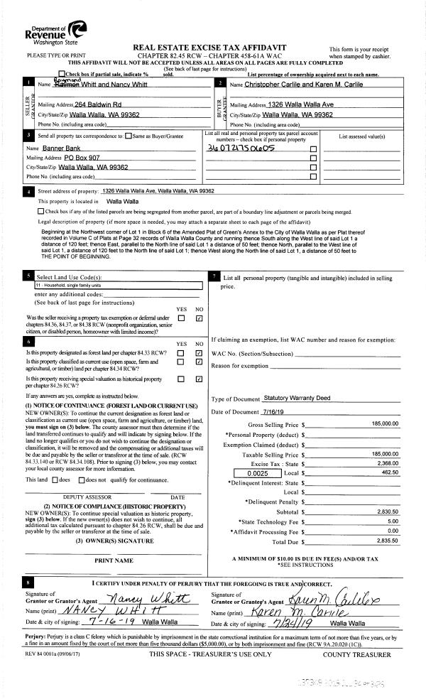 | 1 | 07/24/2019 | SWD | STATUTORY WARRANTY DEED | WHITT RAYMOND & NANCY C | CARLILE CHRISTOPHER D & KAREN M | | | $185,000.00 | 137349 | 2019-05407 |