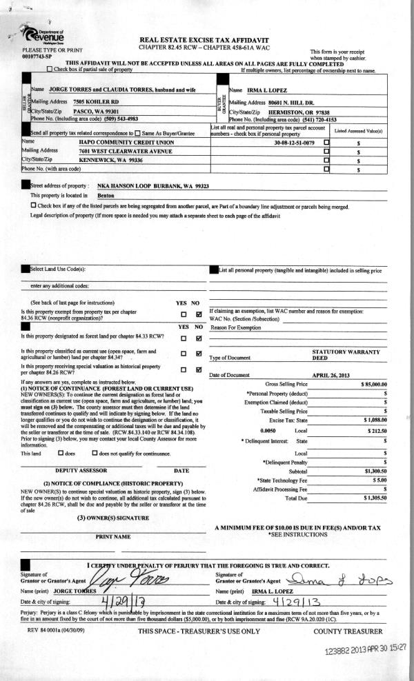 | 2 | 04/30/2013 | WARRANTY D | WARRANTY DEED | TORRES, JORGE & CLAUDIA | LOPEZ, IRMA L | | | $85,000.00 | 123882 | 2013-04266 |