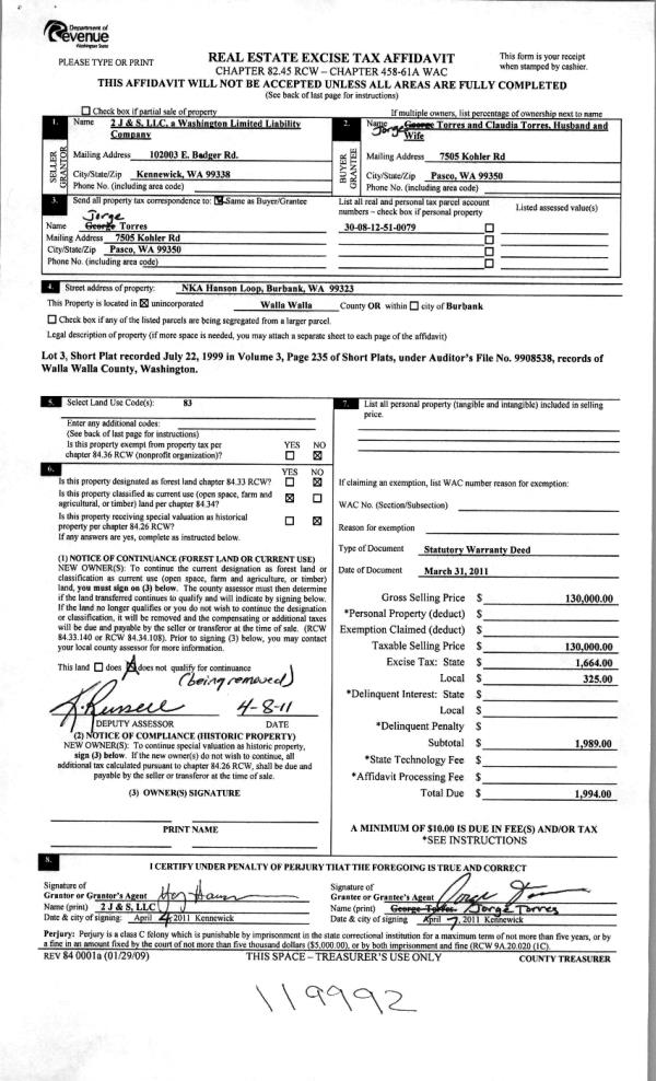 | 3 | 04/08/2011 | WARRANTY D | WARRANTY DEED | 2 J & S LLC | TORRES, JORGE & CLAUDIA | | | $130,000.00 | 119992 | 2011-02949 |