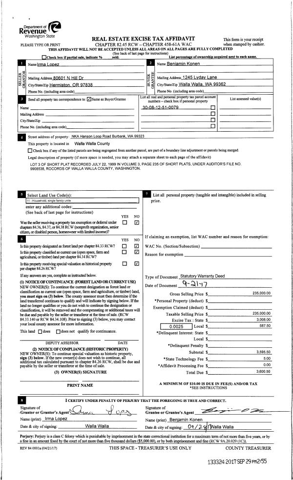 | 1 | 09/29/2017 | SWD | STATUTORY WARRANTY DEED | LOPEZ IRMA L | KONEN BENJAMIN | | | $235,000.00 | 133324 | 2017-07748 |