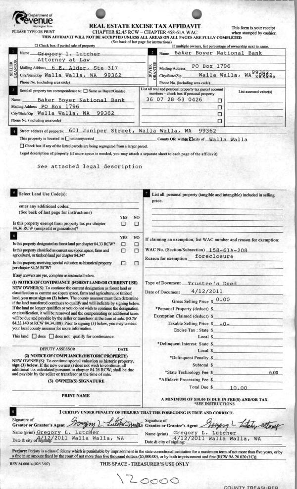 | 4 | 04/12/2011 | WARRANTY D | WARRANTY DEED | LUTCHER, GREGORY AS TRUSTEE FO | BAKER BOYER NATIONAL BANK | | | $130,239.00 | 120000 | 2011-03021 |