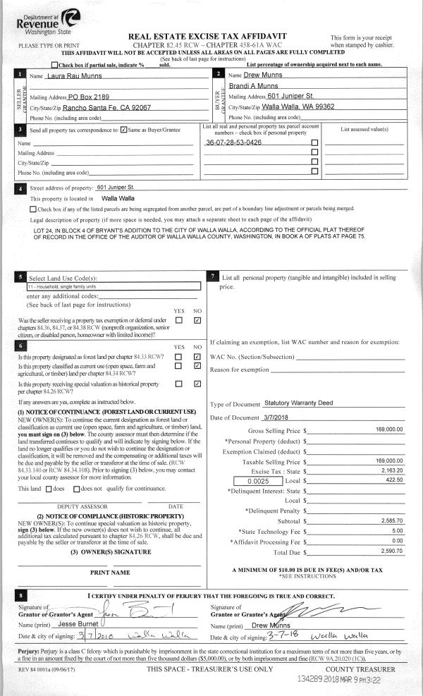 | 2 | 03/09/2018 | SWD | STATUTORY WARRANTY DEED | MUNNS LAURA RAU | MUNNS DREW S & BRANDI A E | | | $169,000.00 | 134289 | 2018-01889 |