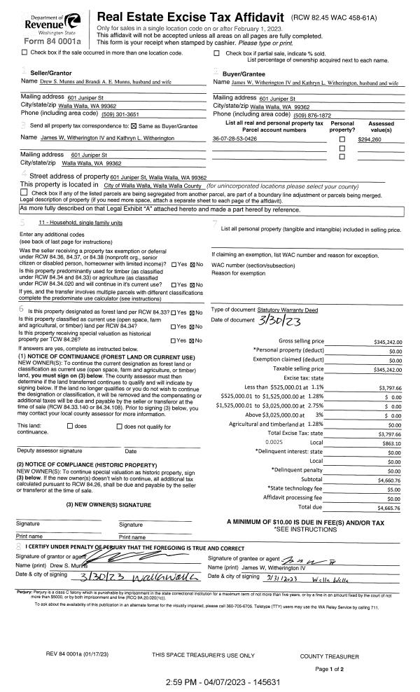 | 1 | 04/07/2023 | SWD | STATUTORY WARRANTY DEED | MUNNS DREW S & BRANDI A E | WITHERINGTON JAMES W IV & KATHRYN L | | | $345,242.00 | 145631 | 2023-01816 |