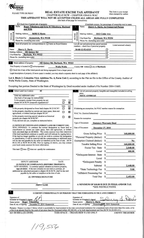| 4 | 12/30/2010 | WARRANTY D | WARRANTY DEED | TILLENBURG, ERIN | DAVIS, SHERRY L | | | $160,000.00 | 119556 | 2010-10876 |