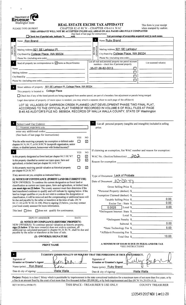 | 4 | 11/01/2017 | LOPA | LACK OF PROBATE AFFIDAVIT | BRAND RONALD WILLIAM ESTATE OF | BRAND RUBY | | | $0.00 | 133549 | 2017-08787 |
