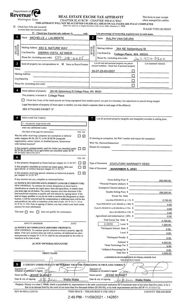 | 1 | 11/09/2021 | SWD | STATUTORY WARRANTY DEED | LALIBERTE MICHELLE J | DEURS RALPH VAN | | | $250,000.00 | 142851 | 2021-13445 |