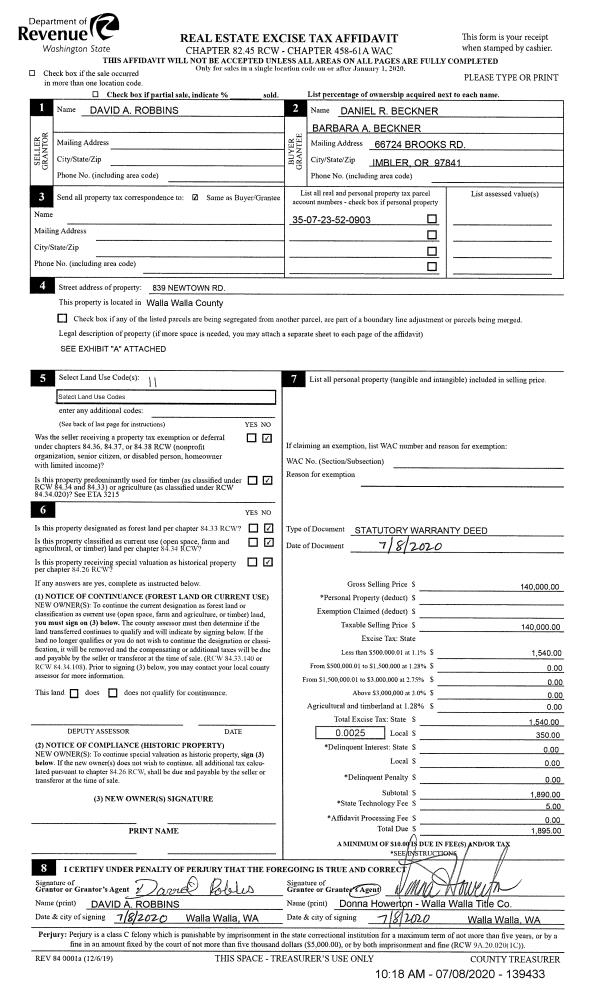 | 1 | 08/26/2020 | SWD | STATUTORY WARRANTY DEED | BECKNER DANIEL R & BARBARA A | BECKNER BRADLEY & KARA | | | $152,000.00 | 139772 | 2020-08558 |