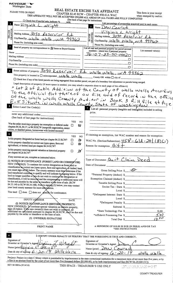| 1 | 06/20/2019 | QCD | QUIT CLAIM DEED | WRIGHT VIRGINIA L | CONRAD DAN | | | | 137113 | 2019-04339 |