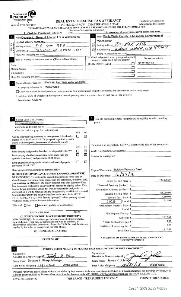 | 1 | 12/28/2018 | SWD | STATUTORY WARRANTY DEED | DOUGLAS L SHARP HOLDINGS LLC | WALLA WALLA COUNTY OF | | | $125,000.00 | 136177 | 2018-10693 |