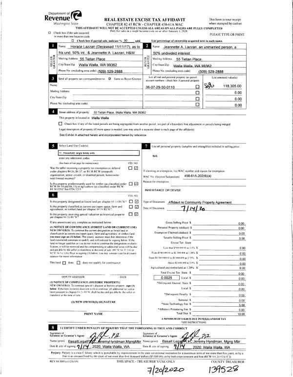 | 2 | 07/20/2020 | COMMUNITY | COMMUNITY PROPERTY AGREEMENT | LAZZARI HORACE | LAZZARI ALEXINE JEANNETTE BEDARD ESTATE OF | | | | 139528 | 2020-06988 |