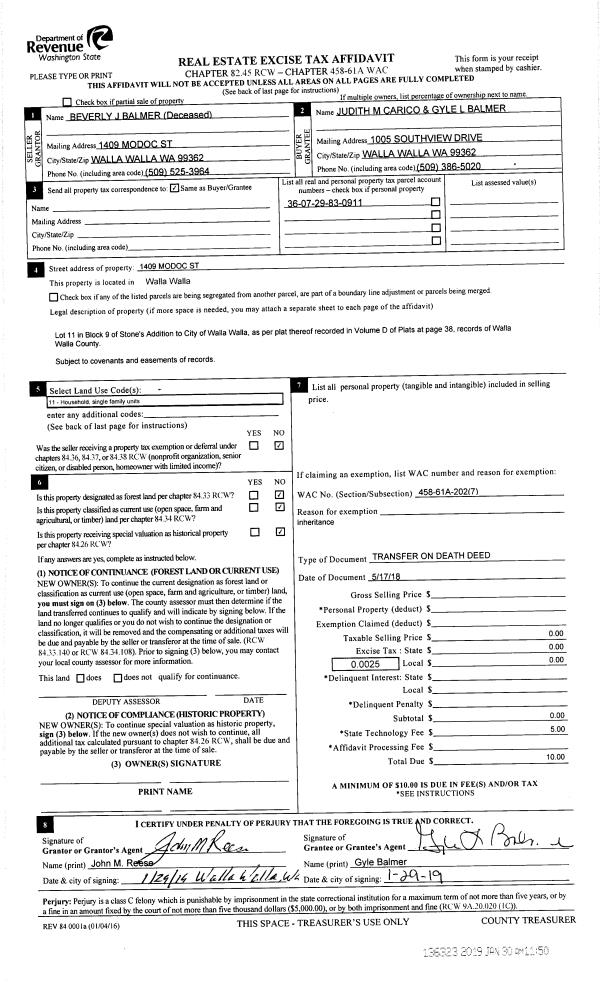 | 3 | 01/29/2019 | TODD | TRANSFER ON DEATH DEED | BALMER BEVERLY | CARICO JUDITH M & GYLE L BALMER | | | $0.00 | 136323 | 2019-00619 |