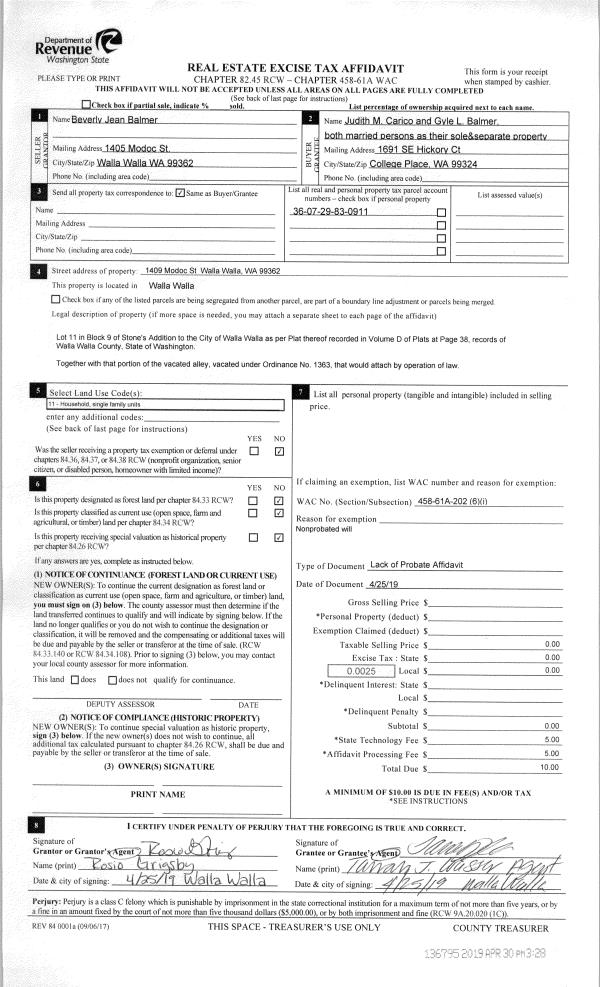 | 2 | 04/25/2019 | LOPA | LACK OF PROBATE AFFIDAVIT | BALMER BEVERLY | CARICO JUDITH M & GYLE L BALMER | | | $0.00 | 136795 | 2019-02817 |