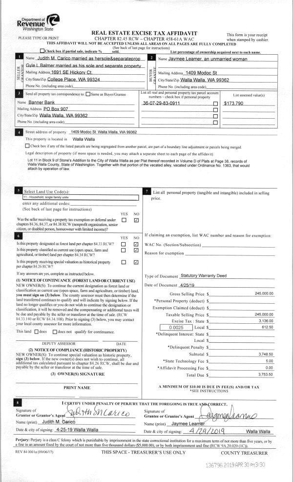 | 1 | 04/30/2019 | SWD | STATUTORY WARRANTY DEED | CARICO JUDITH M & GYLE L BALMER | LEAMER JAYMEE | | | $245,000.00 | 136796 | 2019-02818 |