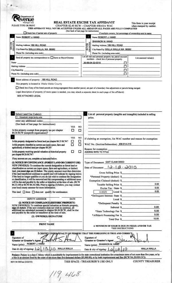 | 4 | 12/17/2010 | QCD | QUIT CLAIM DEED | HAND, ROBERT J | HAND, ROBERT J & SHANNON M | | | | 119468 | 2010-10428 |