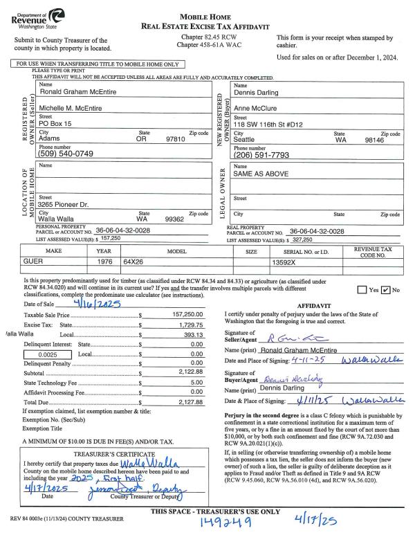 | 1 | 04/17/2025 | MH AFFIDAV | MOBILE HOME AFFIDAVIT | MCENTIRE RONALD GRAHAM | DARLING DENNIS & ANNE MCCLURE | | | $157,250.00 | 149249 | MHAFF-149249 |